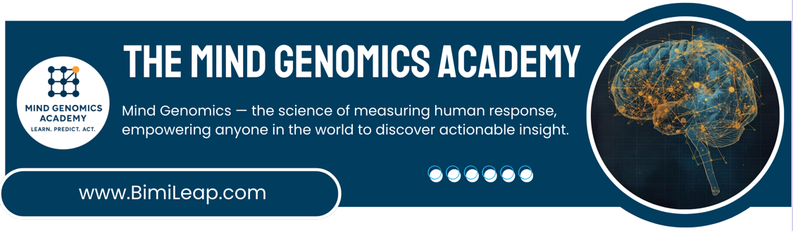 Mind Genomics Academy opens the door to a new way of understanding human decision making. Whether you're a student, educator, creator, community leader, researcher, or simply curious about why people respond the way they do, this is your place to explore the hidden logic behind everyday choices.