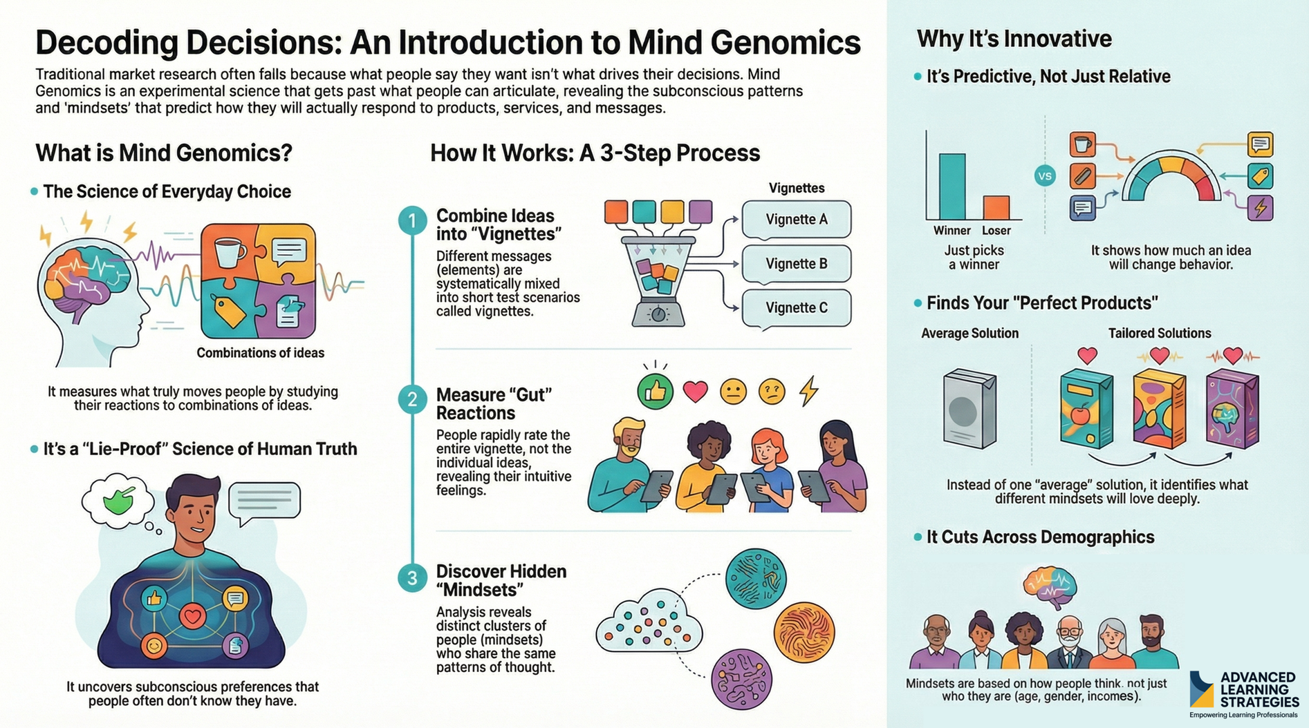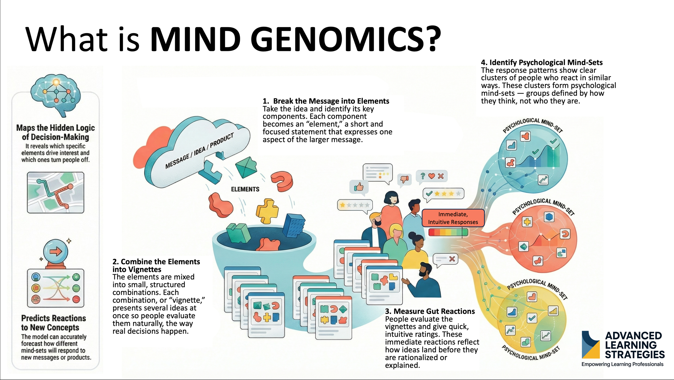 Mind Genomics mixes ideas into short vignettes, captures intuitive reactions, and reveals hidden mindsets that explain what truly drives decisions. Its predictive power uncovers tailored solutions that resonate with different groups and goes beyond demographics to show how people actually think.