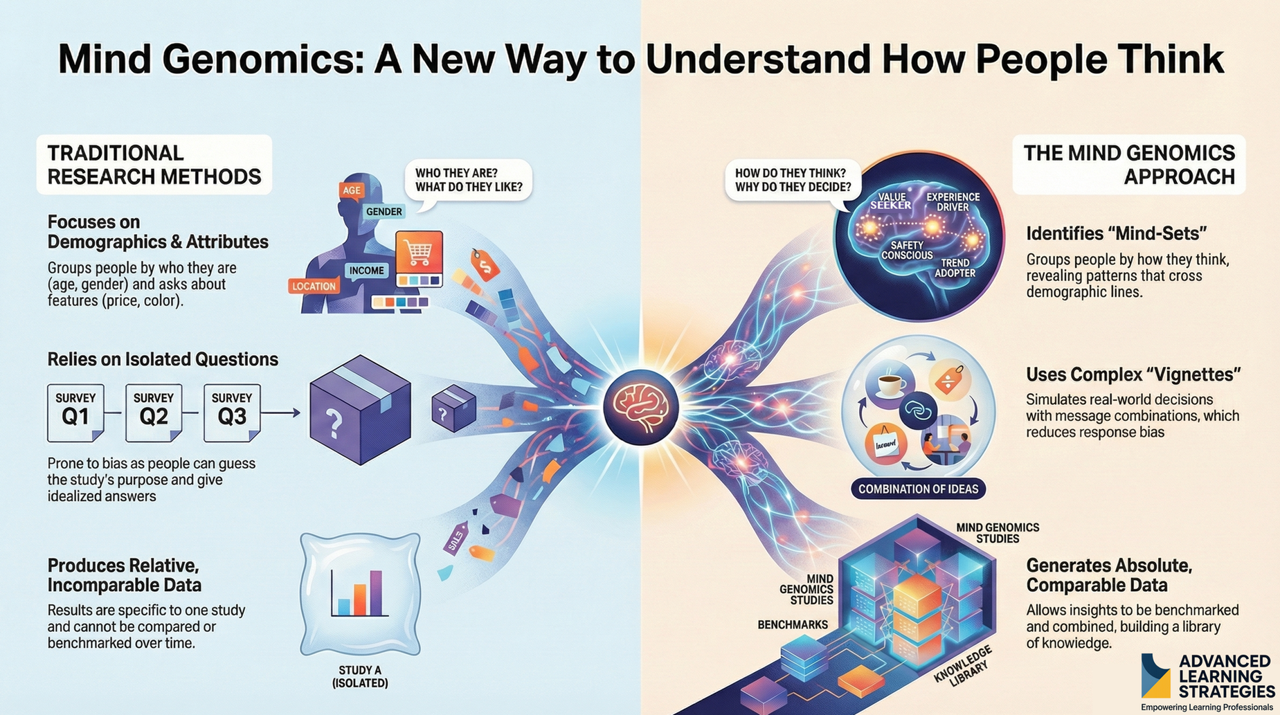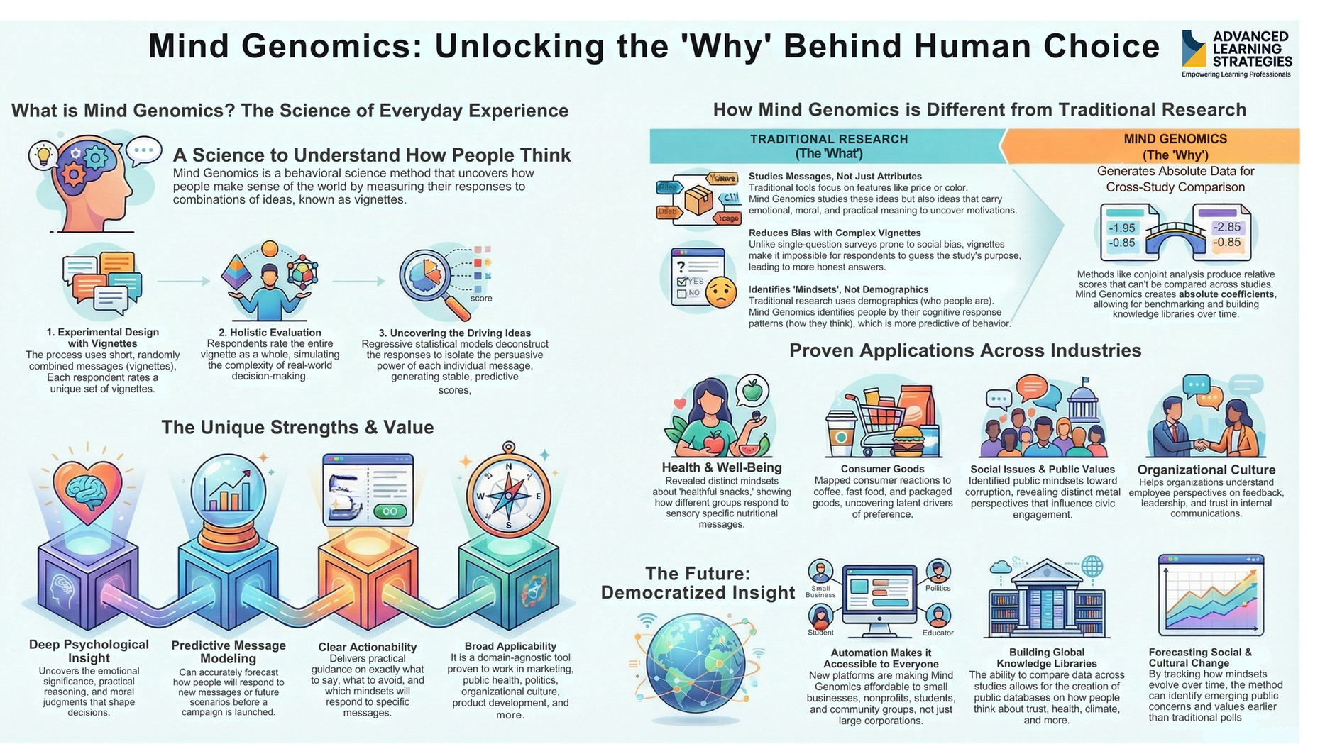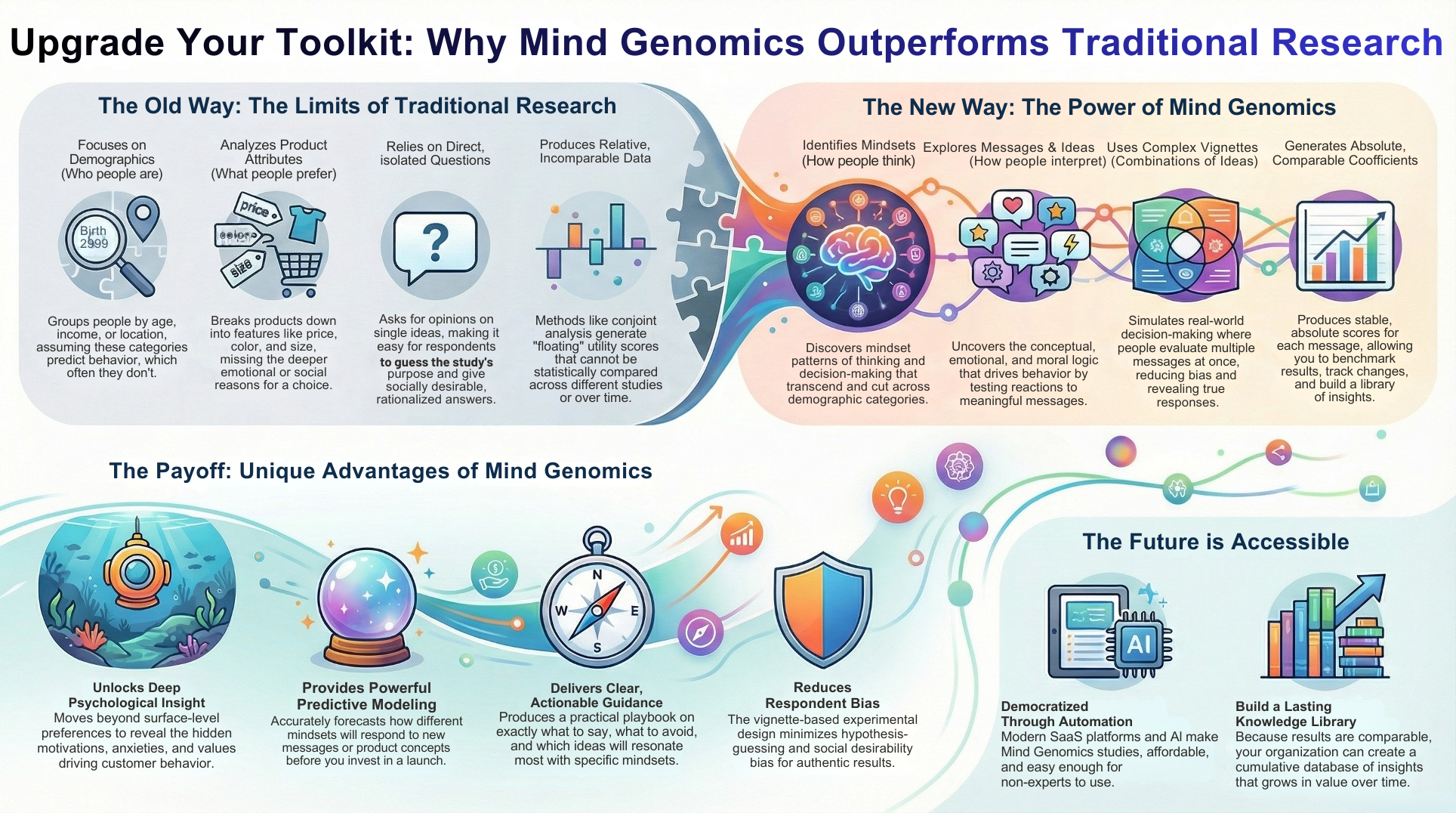 Mind Genomics goes beyond traditional research by uncovering how people think rather than who they are, revealing the deeper logic behind their decisions. Its vignette-based method discovers mindsets, generates stable coefficients, and delivers predictive, actionable guidance while reducing bias and enabling organizations to build a growing library of insight.