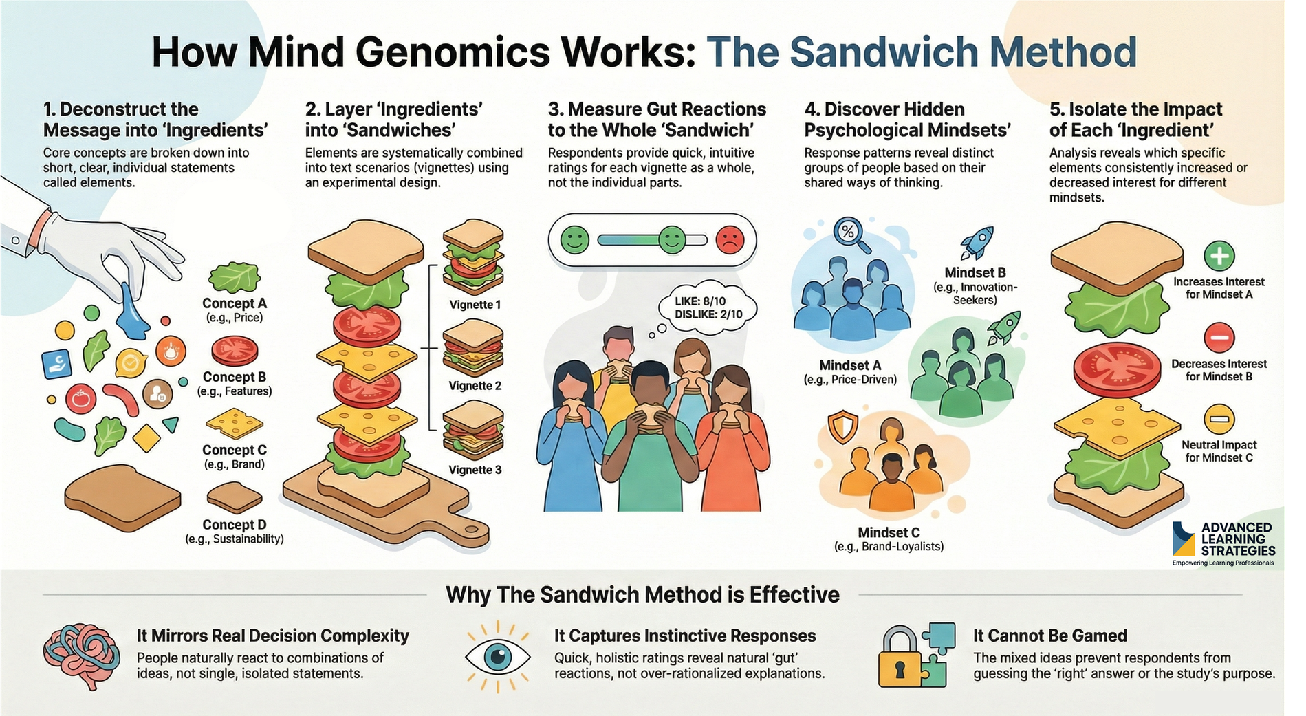 Mind Genomics breaks ideas into simple elements, mixes them into combined “sandwiches,” and measures intuitive reactions to each one. This reveals distinct psychological mindsets and shows which elements increase, decrease, or have no impact on interest, offering a clear, evidence-based map of how different groups think.