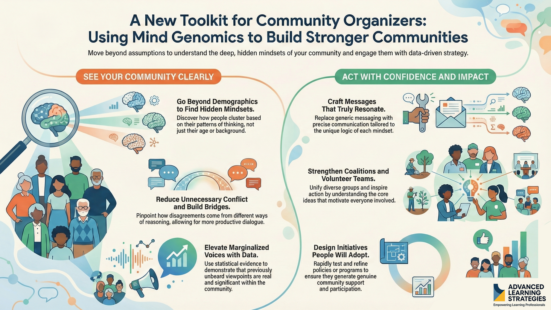 Mind Genomics helps community organizers see beyond demographics to uncover hidden mindsets, reduce conflict, and elevate diverse voices with data. By revealing how different groups think, it enables more resonant messaging, stronger coalitions, and initiatives that communities genuinely support and adopt.
