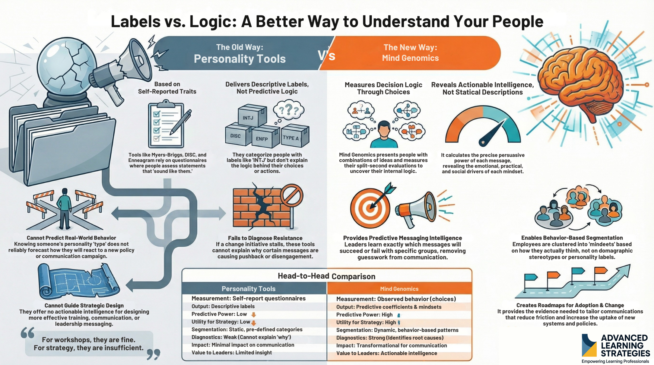 Mind Genomics replaces personality labels with a deeper understanding of how people think, measuring real decision logic instead of self-reported traits. By capturing behavioral patterns, revealing the impact of each message, and identifying cognitive mindsets, it gives leaders actionable intelligence for communication, adoption, and change.