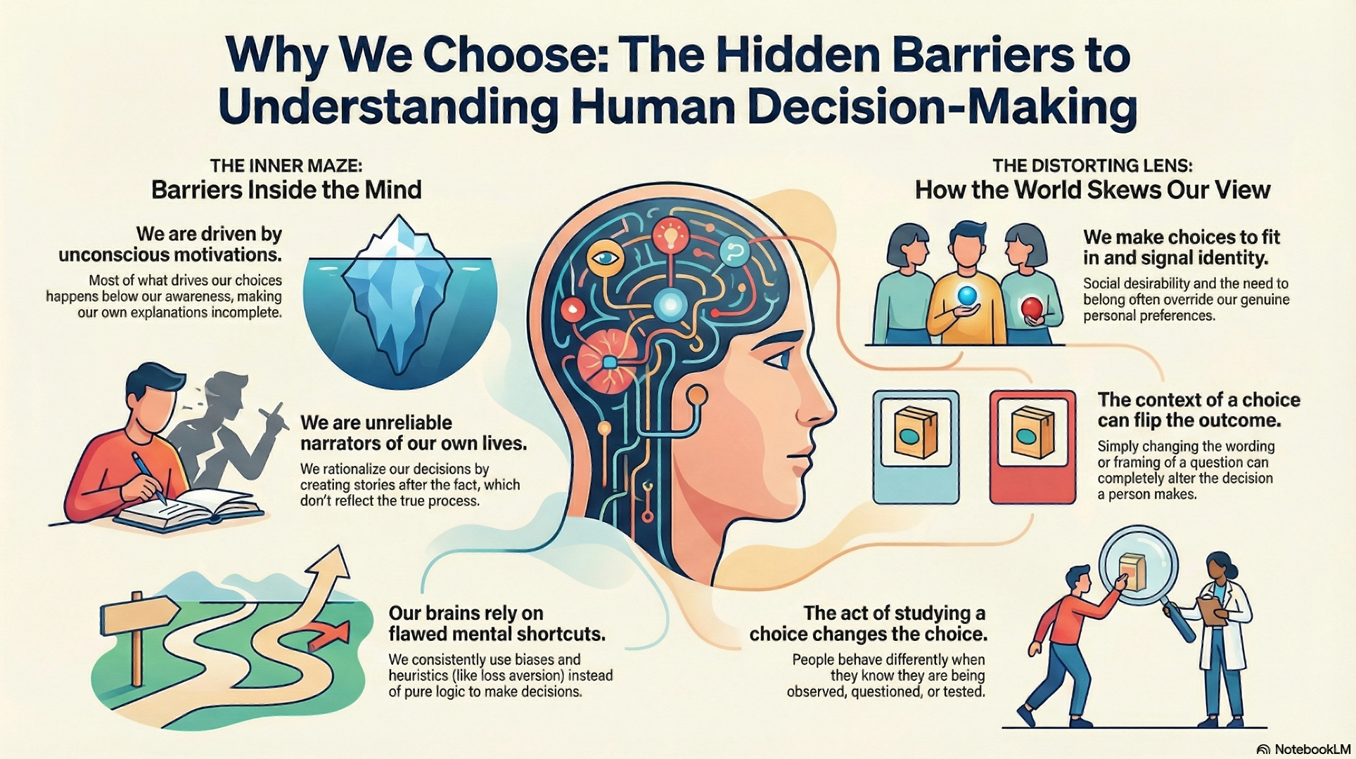 This infographic illustrates the hidden barriers that make human decision-making hard to understand, showing why self-report fails and why real behavioral data is essential. It sets the stage for how Mind Genomics cuts through these distortions to reveal the true drivers of choice.
