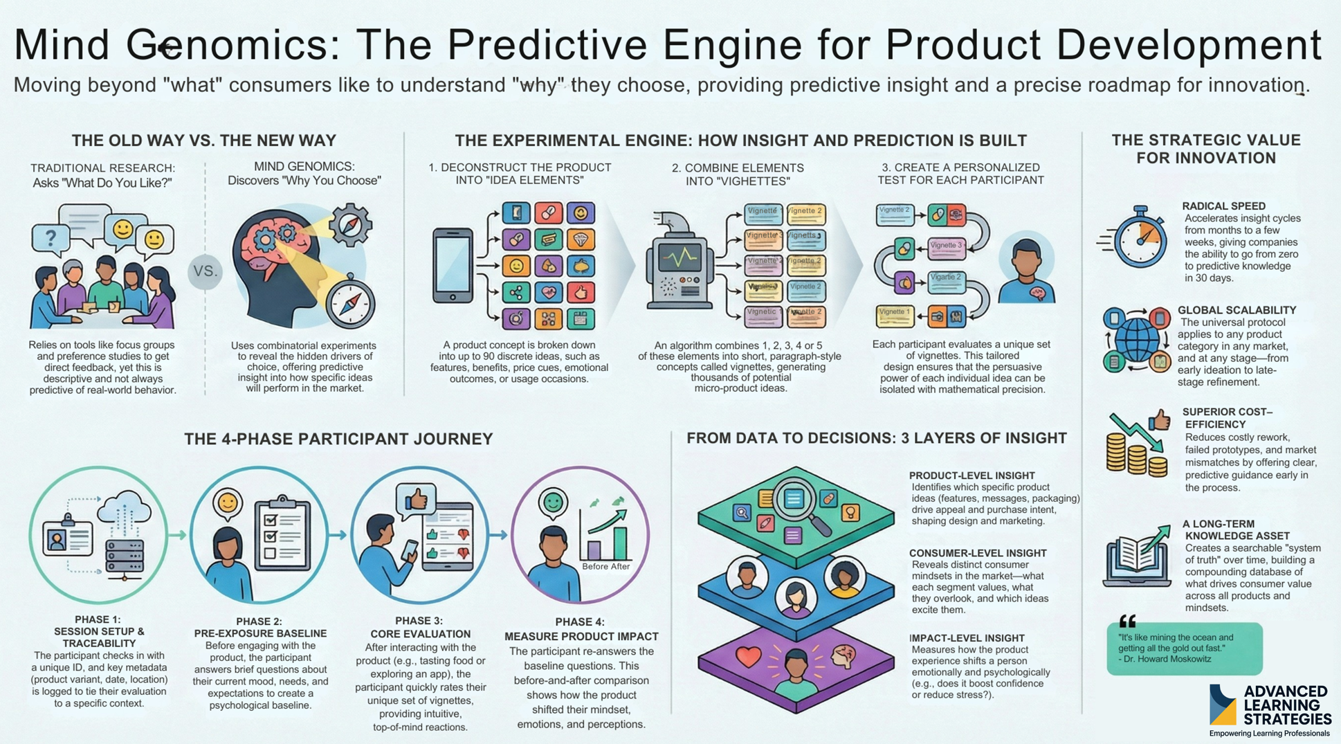 Mind Genomics transforms product development by revealing why consumers choose, not just what they prefer. By breaking concepts into elements, testing mixed vignettes, and isolating each idea’s true impact, it delivers fast, scalable, predictive insight that guides innovation, reduces risk, and builds a long-term knowledge advantage.
