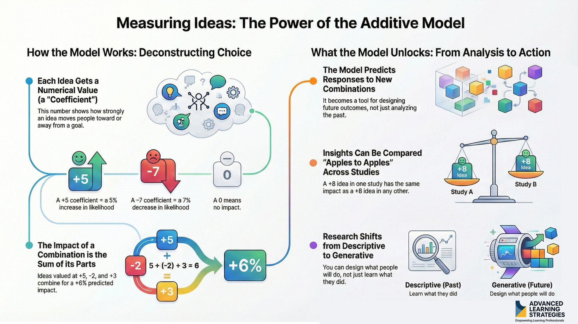 The additive model assigns each idea a numerical coefficient, showing how strongly it moves people toward or away from a goal. By summing these effects, the model predicts reactions to new combinations, compares insights across studies, and shifts research from describing past behavior to designing what people will do next.