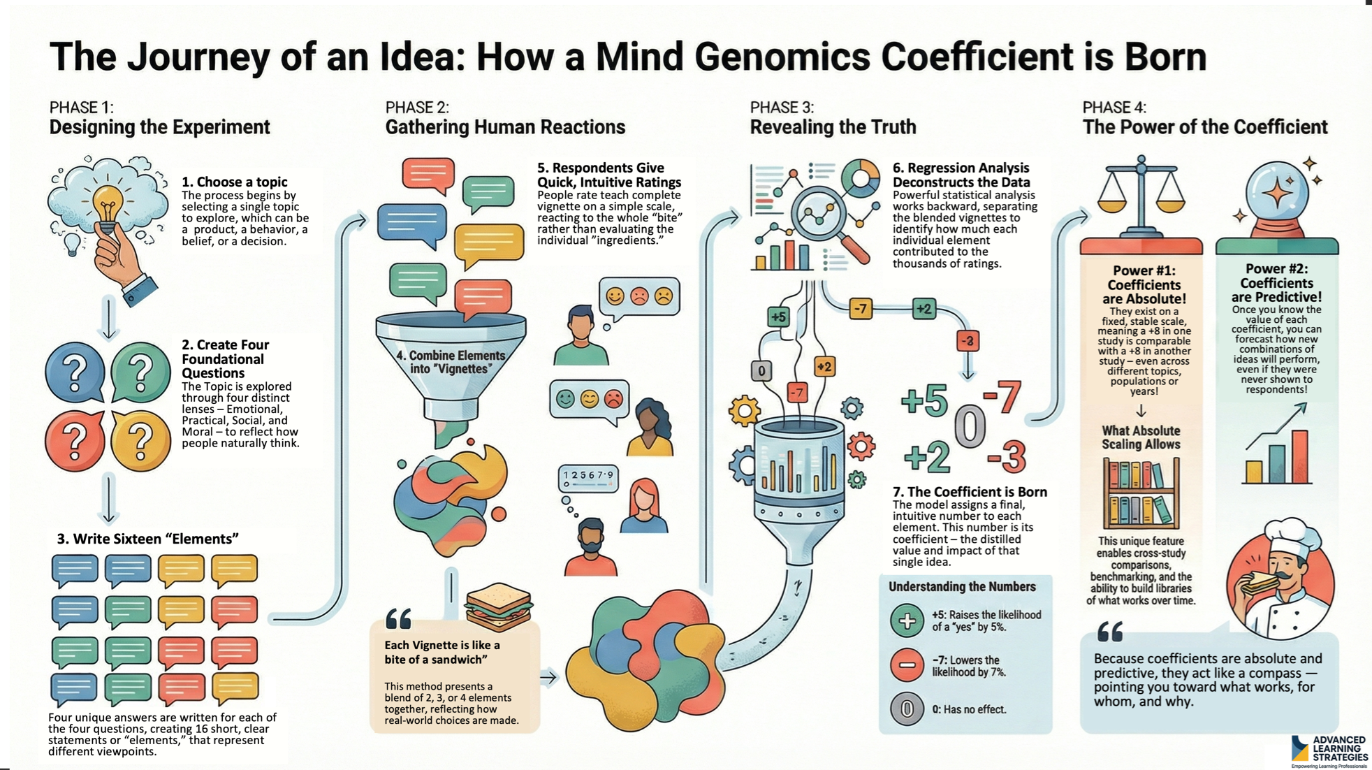A Mind Genomics coefficient emerges through a structured process that breaks a topic into key questions, blends ideas into vignettes, captures intuitive human reactions, and uses regression to isolate each element’s true impact. The result is an absolute, predictive value that works like a compass, showing what drives choices, for whom, and why.