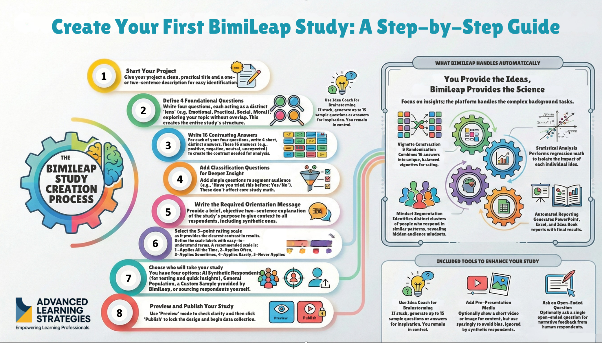 This guide walks users through the full process of designing a BimiLeap study, from defining foundational questions to publishing the final study. It highlights the parts you control (ideas, structure, messages) and the parts BimiLeap automates (vignette creation, randomization, statistical modeling, and segmentation).