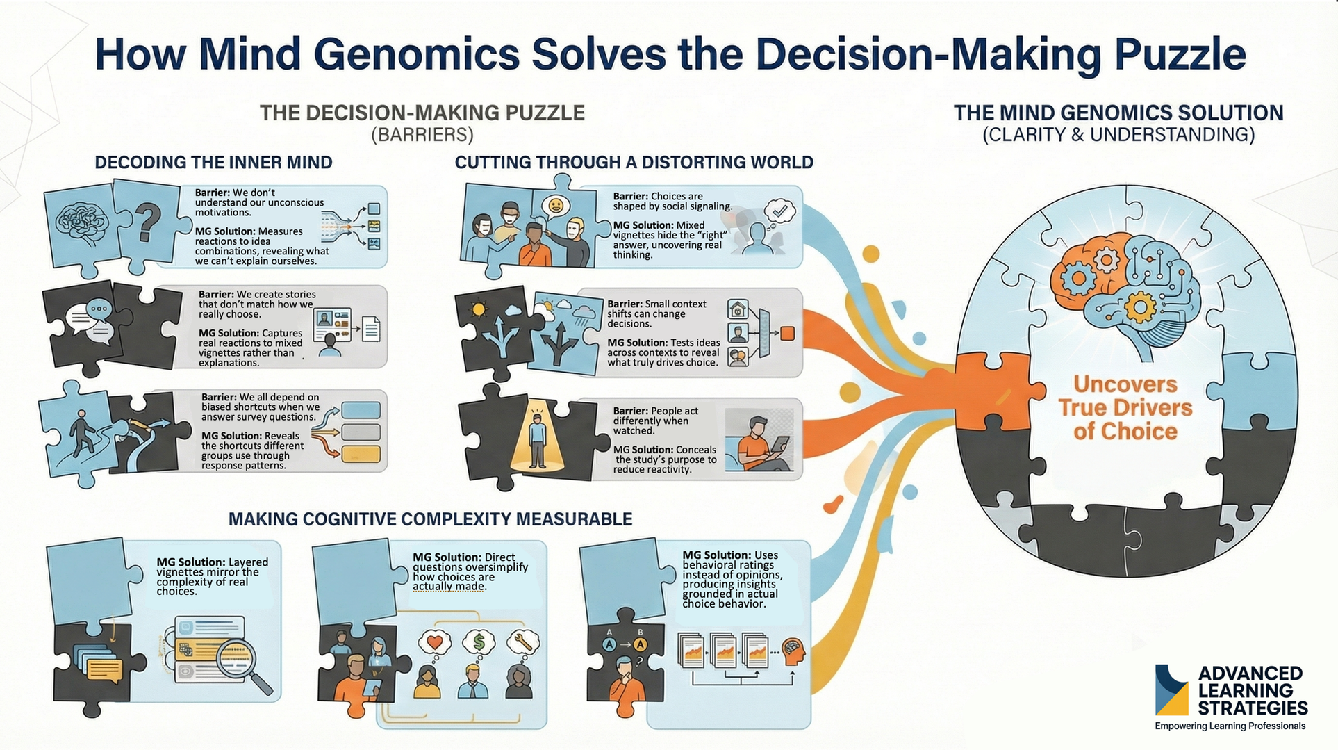 Mind Genomics cuts through the hidden barriers that distort human decision-making by capturing real behavioral responses to mixed idea combinations. It reveals unconscious motivations, filters out social and contextual bias, and makes complex thinking patterns measurable, ultimately uncovering the true drivers behind people’s choices.